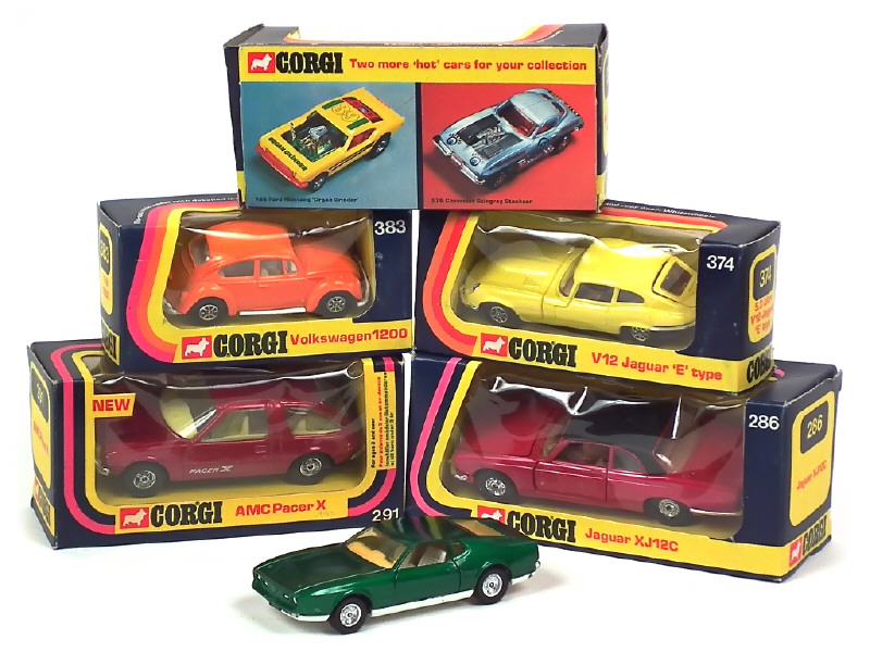 comprend : JAGUAR XJ12C, TYPE E, AMC PACER X (un petit manque de papier sur la boîte), FORD MUSTANG MACH I (état 'B') & VOLKSWAGEN 1200