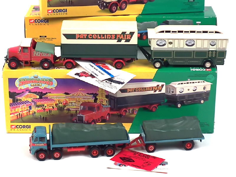 collection THE SHOWMANS RANGE - comprend : ERF DODGEM transport d'autos-tamponneuses avec remorque 'PAT COLLINS' (avec certificat d'édition limitée numéroté 220/14300 exemplaires), ATKINSON avec remorque bâché 'CROW'S' (avec certificat d'édition limitée numéroté 3891/14300 exemplaires) & SCAMMELL HIGHWAYMAN fourgon avec caravane 'PAT COLLINS' (avec certificat d'édition limitée numéroté 3805/14300 exemplaires) - petits manques de papier sur les boîtes