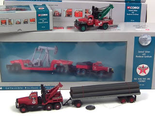 échelle 1/50ème - séries limitées - comprend : DIAMOND T980 BALLAST (boîte légèrement encrassée), KENWORTH W925 semi-remorque, DIAMOND T980 WRECKER avec remorque (avec certificat d'édition limitée numéroté 2950/4000 exemplaires) & MACK B SERIES WRECKER