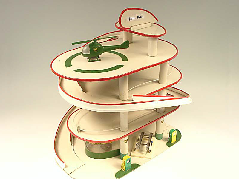 dimensions : 44 x 29 x 46 cm - avec pompes à essence, pont pour voitures, héli-port & hélicoptère en fonte d'aluminium aux couleurs de la companie pétrolière