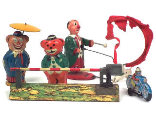 comprend : 2 clowns (un jongleur & un dresseur de chien), un tigre & motocycliste - tous les moteurs fonctionnent - quelques traces d'oxydation par endroits - une clé manquante - on y retrouve notamment la marque JOUSTRA - on y joint une barrière de passage à niveau de la marque JEP