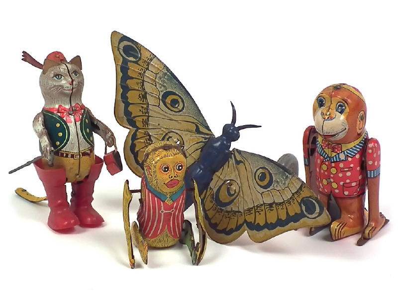 comprend : 2 singes acrobates (dont un en état 'B') & un chat botté - on y joint un papillon articulé en tôle (jouet de parquet avec manques) - tous les moteurs fonctionnent poussivement - traces d'oxydation plus ou moins importantes - on y retrouve les marques : JOUSTRA & YANOMAN TOY