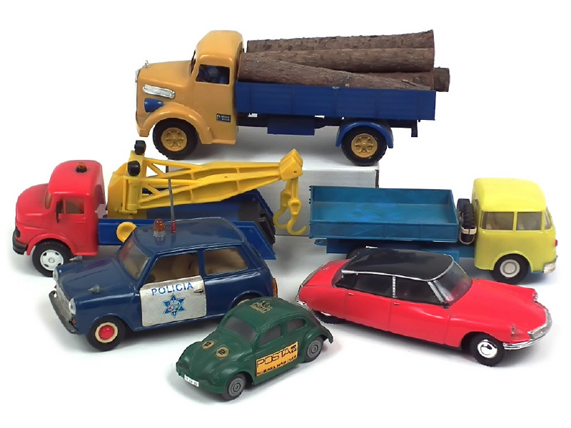 différentes échelles - réalisation en tôle & plastique - comprend notamment : VOLKSWAGEN COCCINELLE 'POSTA', MINI 'POLICIA', CITROEN DS 19 téléguidée (manque câblage & télécommande) & MERCEDES 112 dépanneuse - on y retrouve notamment les marques : PEPE, OSUL & RM - 4 modèles motorisés dont un à revoir