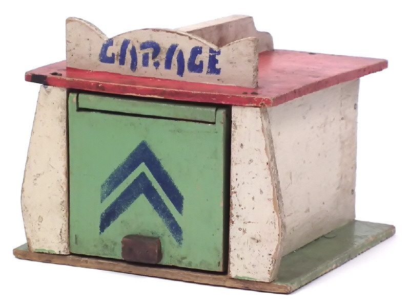 dimensions : 18 x 17,5 x14 cm - réalisation en bois - avec chevron CITROEN au pochoir sur la porte rabattable - quelques craquelures par endroits & manques de peinture
