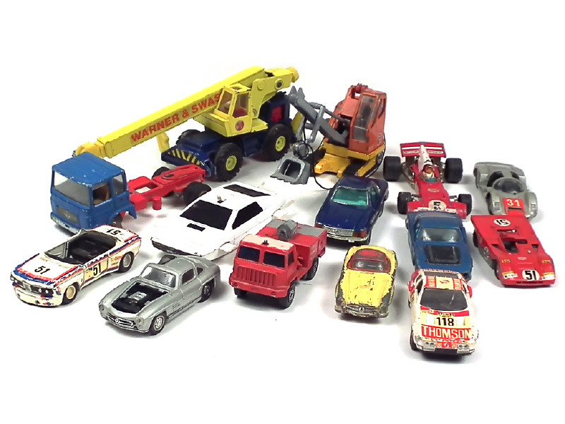 états de 'E' à 'F' - miniatures reproduisant notamment les modèles : MERCEDES (3 exemplaires différents), BMW, FERRARI (3 exemplaires différents), PORSCHE, ISO GRIFO, SAVIEM, LOTUS & BERLIET - on y retrouve les marques : CORGI TOYS & SOLIDO