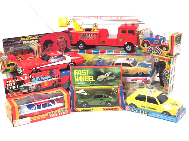 différentes échelles - 6 modèles avec moteur à friction non testés - miniatures reproduisant notamment les modèles : FORD (téléguidé non testé), JAGUAR, MERCEDES (2 exemplaires différents dont un téléguidé non testé), PORSCHE & VOLKSWAGEN - on y retrouve notamment les marques : LUCKY, PLAYART, JIMSON & GALOOB