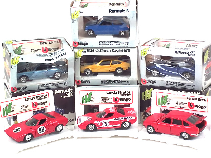 échelle 1/24ème - miniatures reproduisant les modèles : RENAULT (2 exemplaires différents) , BMW, ALFA ROMEO, LANCIA (3 exemplaires différents), MATRA SIMCA & ALPINE RENAULT (2 exemplaires différents dont un avec plancher cassé & petits manques) - boîtes déformées & blisters déchirés