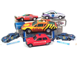 différentes échelles - comprend : ALPINE RENAULT A 310 'POLICE' (moteur à piles non testé, roues arrière cassées & gyrophare à repositionner, boîte 'c'), LANCIA STRATOS rallye téléguidée (non testée), PORSCHE CARRERA RS (moteur à friction fonctionne, état 'B', quelques traces d'oxydation), ALPINE A310 SAFARI téléguidée (non testée, état 'C', sans boîte), RENAULT 5 'SAPEURS POMPIERS' (moteur à piles non testé, décalques tachés, sans boîte), CITROEN 11 BL & ALPINE RENAULT A110 BERLINETTE (dont une en kit à monter) - boîtes déformées & blisters déchirés