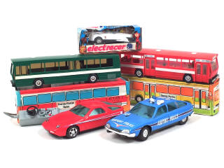 différentes échelles - comprend : PORSCHE 928 (moteur à friction fonctionne), CITROEN CX 2200 'AIRPORT POLICE' téléguidée (moteur à piles non testé, une attache de gyrophare cassée, un petit élément manquant), MATRA (moteur à piles non testé, avec planche de décalques), BERLIET autobus (2 exemplaires différents, moteur à piles non testé (avec 2 tickets de bus & planche de décalques) & moteur à friction fonctionne) - on y retrouve les marques : JOUSTRA, MONTBLANC & CITAP