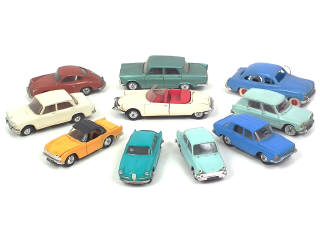 comprend : CITROEN DS19 cabriolet, AMI 6, ALFA ROMEO GIULIETTA, PORSCHE CARRERA 1500 (manque antenne), FIAT 2300, RENAULT 10, SIMCA 1300, DAF DAFFODIL, FORD VEDETTE & TRIUMPH TR5 - détails de peinture ajoutés sur quelques exemplaires - carrosseries & jantes plus ou moins déformées & fondues