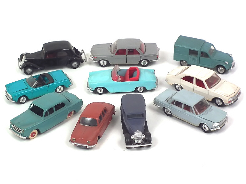 comprend : CITROEN 3CV fourgonnette, 11A 1936 (manque malle), SIMCA OCEANE, 1501, FIAT 1500 cabriolet, PEUGEOT 201, 403, 504, BMW 2000 & RENAULT DAUPHINE- détails de peinture ajoutés sur quelques exemplaires - carrosseries & jantes plus ou moins déformées & fondues