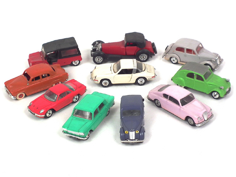 comprend : SIMCA 9 ARONDE, 1200, FIAT 1500, LANCIA AURELIA, MERCEDES SSK (manque plaque minéraloguque arrière), RENAULT JUVAQUATRE, ALPINE A110, PORSCHE 911 L, CITROEN MEHARI & 2CV AZ LUXE - détails de peinture ajoutés sur quelques exemplaires - carrosseries & jantes plus ou moins déformées & fondues