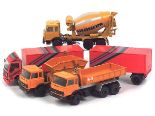 états de 'B' à 'C' - comprend : FORD CARGO fourgon avec remorque fourgon (un rétroviseur cassé), MAGIRUS IVECO benne mobile (éclats majeurs sur la benne), mulitibenne (éclats majeurs sur la cabine & manque un petit élément de bras) & IVECO toupie à béton 'LIEBHERR' - on y retrouve les marques : CONRAD & NZG