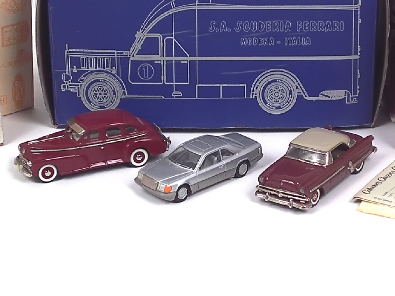 comprend : CHEVROLET (2 exemplaires différents), FORD, MERCEDES (petits manques), MERCURY (3 exemplaires différents) & ALFA ROMEO (boîte en état 'a', avec surboîte en état 'b') - on y retrouve les marques : COLLECTOR'S CLASSICS, EXOTO, CENTURY & GOLD VARG COLLECTIONS