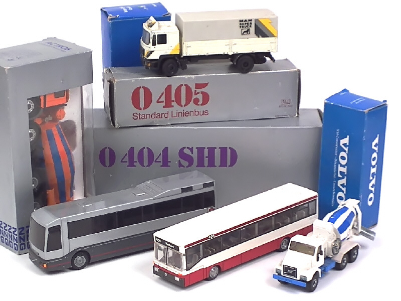 états de 'A' à 'D' - comprend : MAN, MERCEDES (3 exemplaires différents dont les fixations d'un vitrage latéral d'un bus cassé) & VOLVO (2 exemplaires différents) - on y retrouve les marques : CONRAD, NZG & SIKU - 2 carrosseries poussièreuses - boîtes de 'a' à 'd'