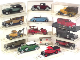 série 'AGE D'OR' - miniatures reproduisant les modèles : CADILLAC (4 exemplaires différents), CITROEN (5 exemplaires différents), CORD, DODGE, DUESENBERG, HISPANO SUIZA, MERCEDES (boîte en état 'c') & TALBOT - petits manques - boîtes encrassées