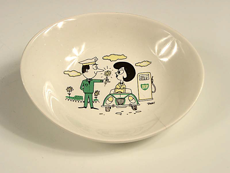 diamètre 11cm - représentant un dessin humoristique d'un pompiste offrant une fleur à une conductrice - en céramique - publicité 'BP'