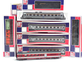 comprend : voiture de voyageurs (7 pièces dont 2 références en double exemplaires) & wagon-plateau porte-container - 7 modèles sous film plastique jamais ouvert - une boîte en état 'c'