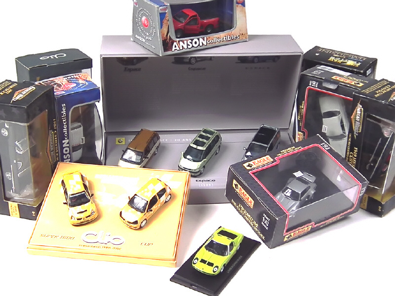 miniatures reproduisant les modèles : RENAULT (7 exemplaires différents dont 5 regroupés dans 2 coffrets), BMW, MINI COOPER (2 exemplaires identiques), FORD (2 exemplaires différents), LAMBORGHINI, PORSCHE, PLYMOUTH, MERCURY, CHRYSLER & LINCOLN - on y retrouve les marques : UNIVERSAL HOBBIES, JADI, ANSON, ERTL & SUNSTAR - quelques petits manques - 2 boîtes en état 'c'