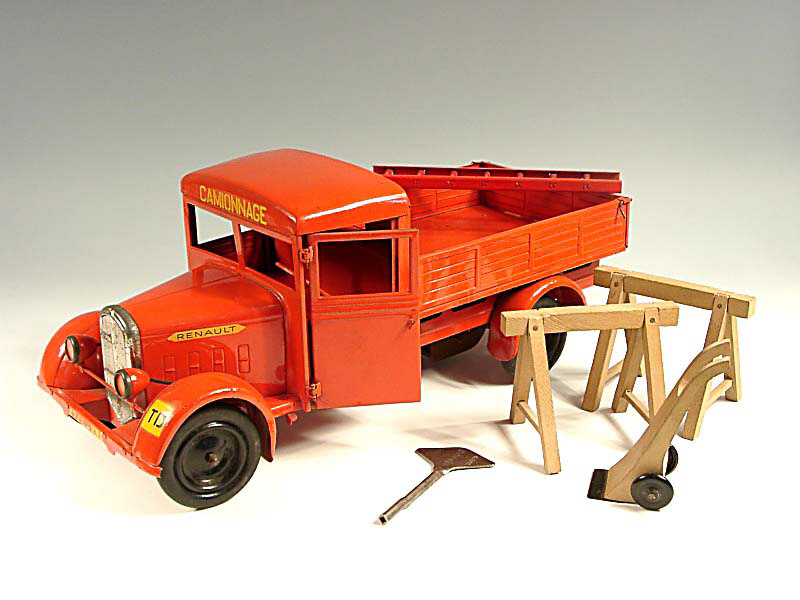 longueur 42 cm - version luxe avec phares électriques (à revoir) & moteur mécanique à clef (fonctionne) - mentions 'CAMIONNAGE' sur le fronton de la cabine & 'TD' sur l'aile avant gauche - complet avec deux tréteaux, échelle, diable & clef - SUPERBE !