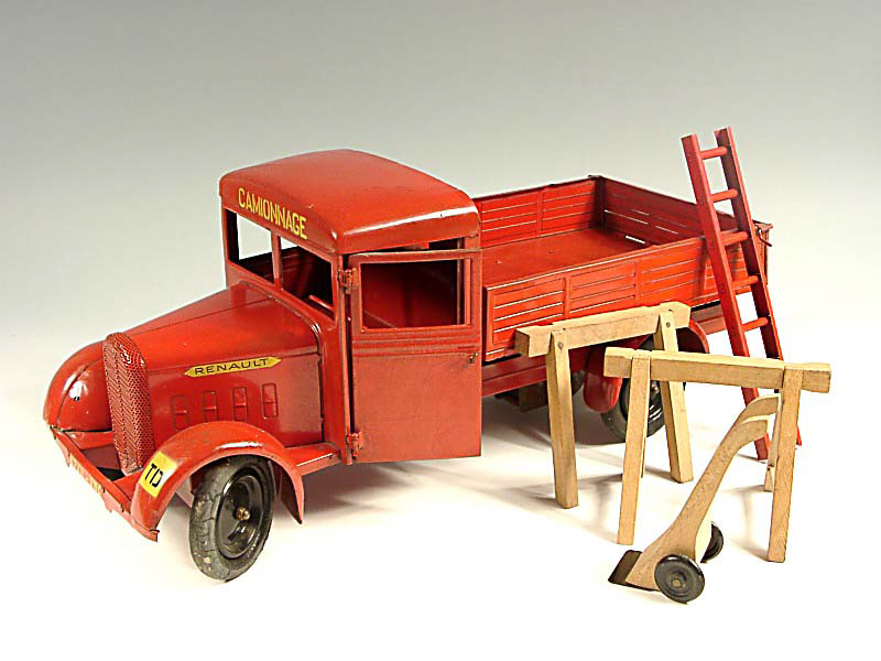 longueur 42 cm - version économique sans phares électriques - moteur mécanique à clef (fonctionne) - mentions 'CAMIONNAGE' sur le fronton de la cabine & 'TD' sur l'aile avant gauche - avec deux tréteaux (dont un incomplet), échelle & diable - un pneu remplacé - intéressante version avec calandre en 'MASQUE A GAZ' - SUPERBE !