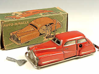longueur 13,5 cm - moteur à clef (fonctionne) - en action la voiture avance puis s'arrête tandis que la porte du conducteur & le capot s'ouvrent - elle redémarre en changeant de direction & les mouvements se répètent