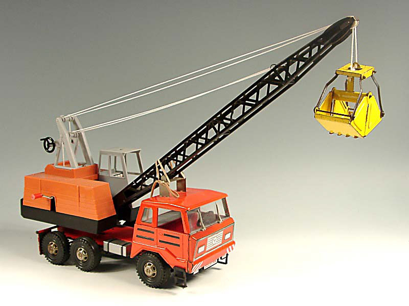 longueur 55 cm - moteur à clef (fonctionne) - 3 manivelles permettent de manoeuvrer la grue - les essuie-glace du camion sont fonctionnels