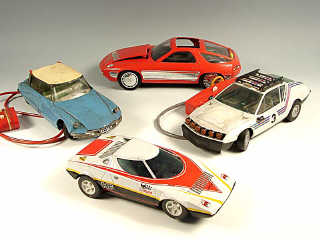longueur 29 cm - moteur à pile (fonctionne) - avec phares lumineux - direction à revoir - boîtier de commande incomplet - déformation du toit en plastique