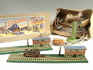 moteur à clef (fonctionne) - les rails constituent un circuit aérien axé sur une tour - clef & notice - manque toit de la gare