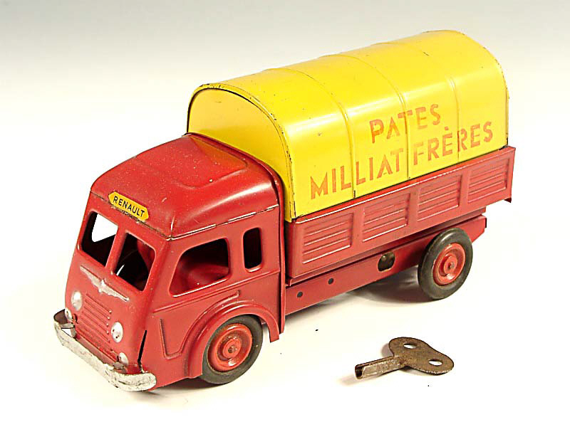 longueur 16 cm - moteur à clef (fonctionne) - décalcomanie 'RENAULT' sur le front de la cabine - avec publicité 'PATES MILLIAT FRERES' - PROMOTIONNEL