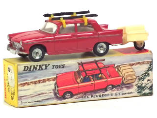 DINKY TOYS (FRANCE) 536 PEUGEOT 404 avec remorque monoroue (skis noirs) rouge