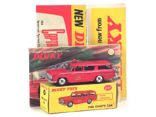 version avec gyrophare à section plate - décoration FIRE CHIEF de couleur jaune - l'état est du principalement à 3 éclats majeurs sur l'aile avant gauche - on y joint un catalogue 1966 (état 'b' avec une agrafe sur la couverture) & 2 affichettes (état 'b') présentant quelques modèles de la marque