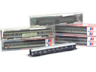 comprend : voiture de voyageurs (3 exemplaires différents) & voiture-lits - on y joint 2 voitures de voyageurs de la marque LIMA (avec boîtes ROCO) - quelques petites fêlures sur les boîtes