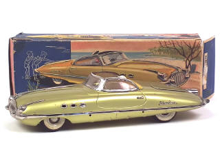longueur : 35 cm - moteur à piles (non testé) - avec conducteur, levier de commandes & direction par le volant (fonctionne) - importants manque de peinture sur le volant - quelques parties chromées très légèrement ternies - vitrage détaché par endroits avec petits manques - certaines barres de calandre plus ou moins fendues (avec un petit enfoncement)
