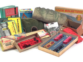 comprend notamment : maisons, grue, pelleteuse, sachets de décors, tunnels & accessoires de voies - on y retrouve notamment les marques : AIRFIX, KIBRI, BUSCH, JOUEF, LE DISQUE ROUGE & JOUET HACHETTE - on y joint un coffret 'TRAIN MAGNETIQUE' (réalisation en bois) de la marque DIDAC - quelques petits manques