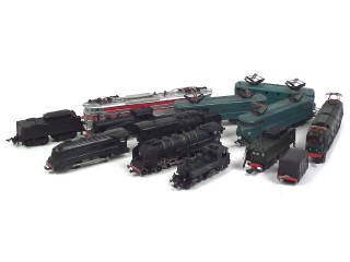non testé - états de 'A' à 'C' - comprend : locomotive à vapeur type 231 (2 exemplaires différents dont un avec tender non conforme), 040, 020 avec tender, motrice électrique BB 9201 (2 exemplaires), 2D2 5516, BB 9004 & CC 40108 (quelques transformations & parties repeintes) - on y joint une locomotive à vapeur 2502 de la marque ROCO - quelques manques