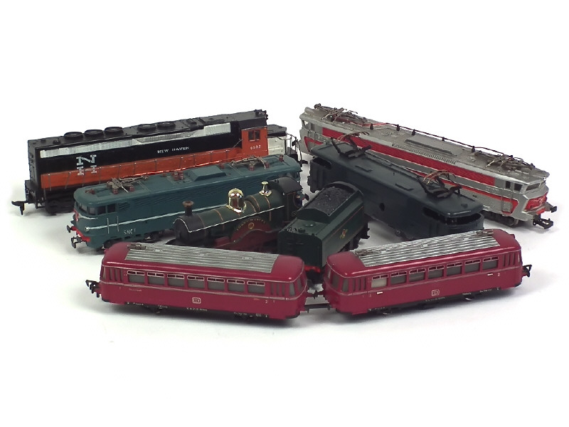 non testé - comprend : locomotive à vapeur type 211 avec tender 'BRITISH RAILWAYS', autorail 2 éléments 'DB', motrice BB 9201 'SNCF' (en état 'F'), BB 25110 'SNCF', CC 40101 'SNCF' & DIESEL 6502 'NEW HEVEN' - on y retrouve notamment les marques : JOUEF, FLEISCHMANN & TRI-ANG - avec manques & parties cassées