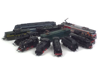 non testé - états de 'A' à 'C' - comprend : locomotive à vapeur type 020 (4 exemplaires dont un parties retouchées), type 140, type 150 avec tender (non conforme), type 040, motrice électrique BB 9201, CC-2104 & DIESEL 70002 - on y joint une motrice DIESEL de la marque LIMA (en état 'F') - avec manques & parties cassées