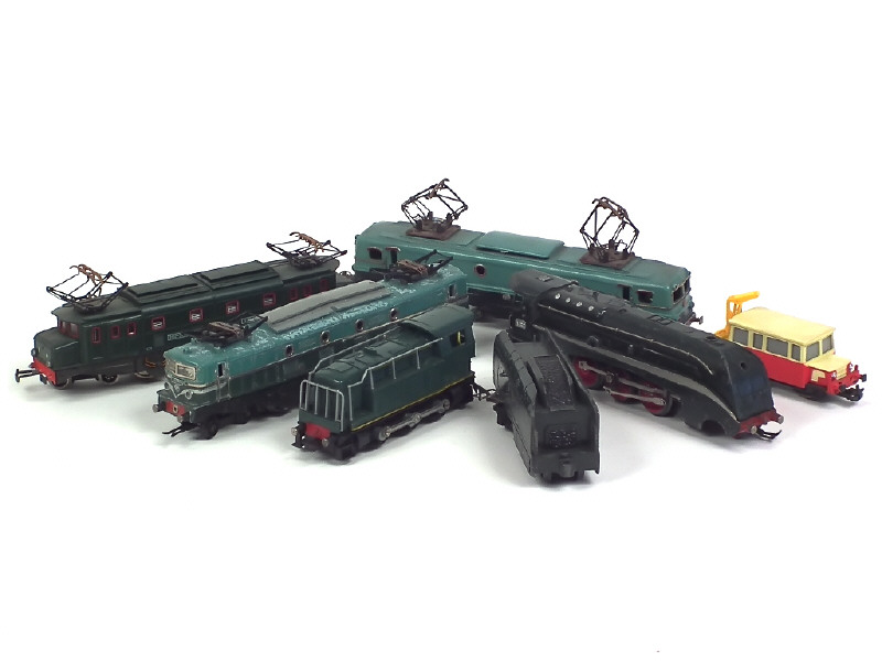 non testé - états de 'B' à 'E' - comprend : locomotive à vapeur carénée type 232 avec tender 'SNCF' (détails de peinture ajoutés), motrice électrique 2D2-9101 'SNCF' (carrosserie légèrement déformée & moisie), 2D2-55 'SNCF', CC 7001 'SNCF' (en état 'R'), motrice DIESEL 030 'SNCF' & 5 M 'SNCF' - on y retrouve notamment les marques : JOUEF & JEP - quelques manques & parties transformées