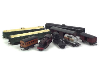 non testé - états de 'A' à 'D' - comprend : locomotive à vapeur type 120, 2 wagons-fourgon à bagages, 2 voitures de voyageurs, 2 fourgons & citerne 'SHELL' - on y joint un wagon-plateau grue de la marque VEBE - avec manques & petites parties non d'origine