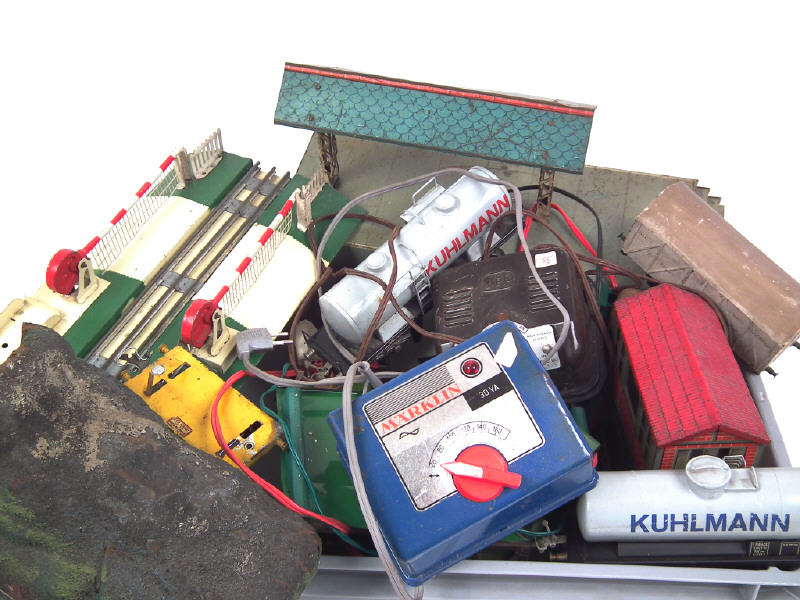 non testé - états de 'C' à 'F' - comprend notamment : wagons (une réalisation artisanale), transformateurs, quai de gare, passage à niveau & accessoires divers - avec manques & quelques transformations - on y retrouve notamment les marques : MÄRKLIN, HORNBY & JEP