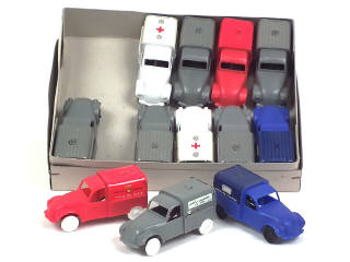 moteurs à friction (fonctionnent) - contient les modèles : 'SECOURS ROUTIERS', 'JOUETS SESAME', S.F.T.E.', 'PONTS & CHAUSSEES DU JURA', 'CROIX ROUGE FRANCAISE' & 'PREMIERS SECOURS VILLE DE PARIS' - véhicules en double exemplaires - quelques petites rayures par endroits
