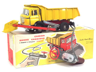 longueur : 38 cm - moteur à pile (à revoir) - avec conducteur, direction & portières ouvrantes - quelques parties chromées très légérement ternies - une fêlure sur le pare-brise - fixations de cabine déficientes (cabine désolidarisée) - petits frottements sur la benne - accrocs mineurs sur la boîte