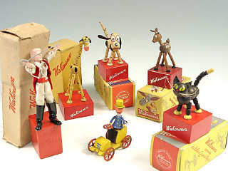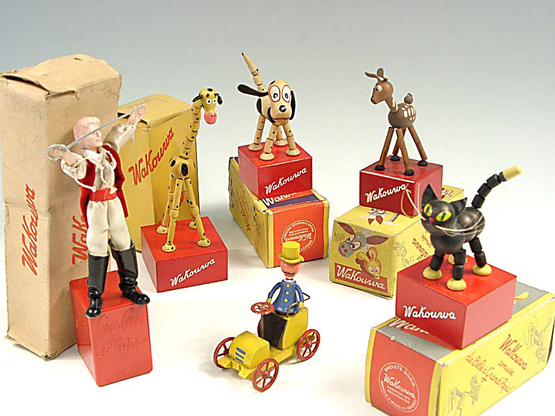 hauteur 11 cm - en bois - un bouton intégré au socle permet de faire bouger la figurine