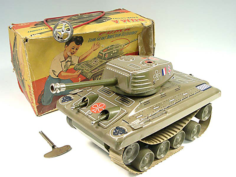 longueur 39 cm - direction téléguidée - moteur à clef (fonctionne) - avec mécanisme de pierre à briquet & canon permettant de tirer des billes - chenilles coupées - avec clef & commande de filoguidage - manque antenne