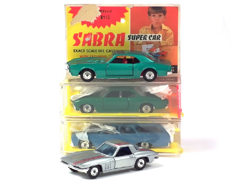 série 'SABRA' - états de 'A' à 'C' - comprend : CHEVROLET CHEVELLE break, CORVAIR, CORVETTE STINGRAY & PONTIAC FIREBIRD - 2 voitures avec boîte (états 'c' & 'd')