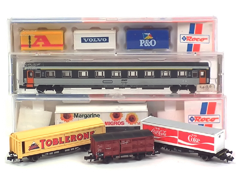 comprend : voiture de voyageurs de première classe 'SNCF' (boîte en état 'c'), 3 wagons de marchandises 'MIGROS', 'TOBLERONE', 'COCA COLA' & wagon à clairevoies - on y joint un ensemble de 3 containers différents - on y retrouve les marques : ROCO, & FLEISCHMANN