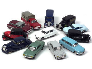 miniatures reproduisant les modèles : PANHARD (2 exemplaires différents), CITROEN (3 exemplaires différents), SIMCA, RENAULT, CHEVROLET, FORD (2 exemplaires différents) & PEUGEOT (2 exemplaires différents)