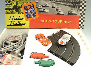 dimensions du coffret : 63 x 44 cm - contient : 2 voitures, 6 rails courbes, 3 rails droits, un transformateur, 2 poignées & accessoires