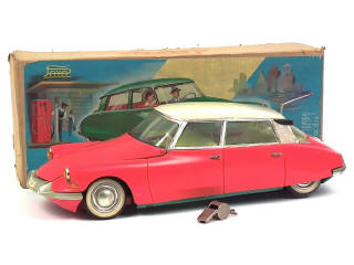 longueur : 41 cm - moteur à piles (non testé) - un ingénieux système avec microphone incorporé dans la voiture permet de faire avancer ou reculer le véhicule - avec sifflet & antenne amovible - une poignée de portière cassée - petits manques sur le sigle de malle arrière - plage arrière incomplète - quelques manques de pellicule chromée & de peinture plus ou moins importants par endroits - pourtours des jantes légèrement fondus - quelques petites éléments de plancher non d'origine
